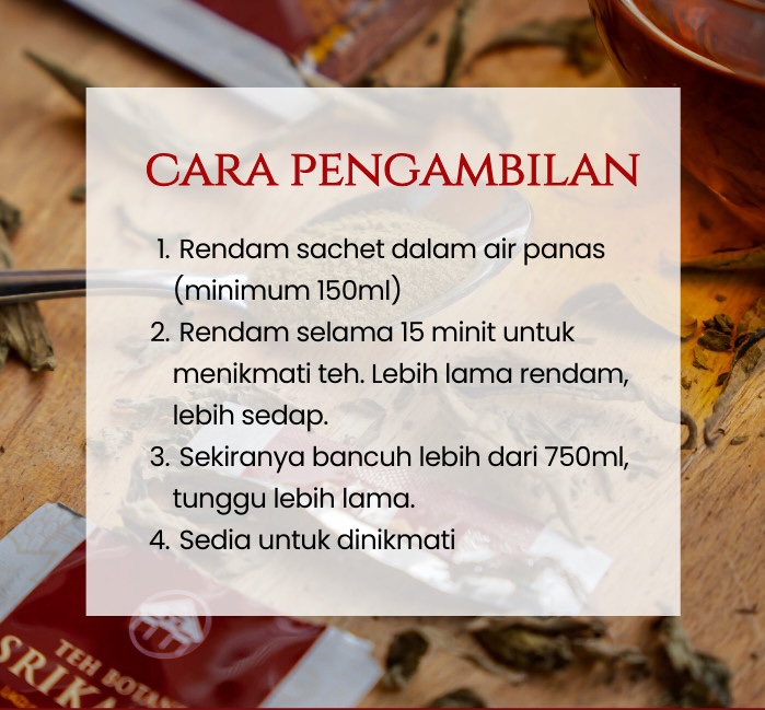 – Dos harian (1 uncang teh dalam 350 ml air panas, minum 2× sehari).